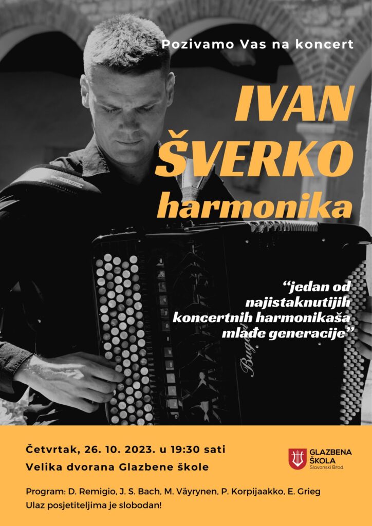 Ivan Šverko, jedan od najistaknutijih koncertnih harmonikaša mlađe generacije i docent klasične harmonike na Muzičkoj akademiji u Puli, dolazi u Glazbenu školu Slavonski Brod održati seminar za učenike Odjela za harmoniku. Ovo je već treće Šverkovo gostovanje u našoj školi te će tijekom triju dana seminara podijeliti s učenicima svoja znanja i iskustva, a osobito pridonijeti napretku onih učenika koji se pripremaju za predstojeće 62. hrvatsko natjecanje u kategorijama komornih sastava.