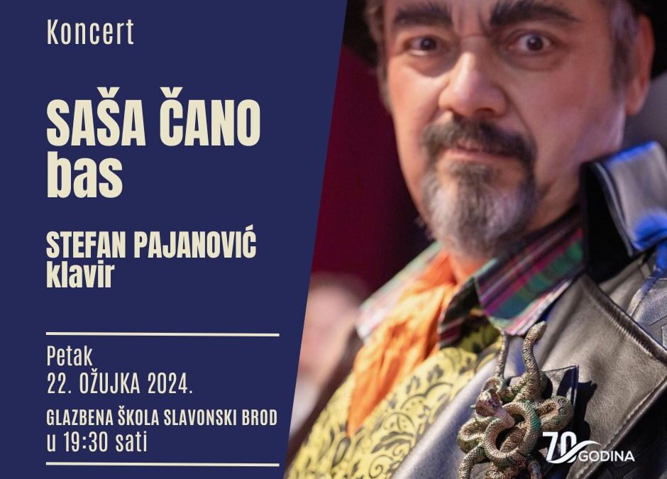 S radošću najavljujemo cjelovečernji koncert na kojemu će glavna zvijezda biti bas Saša Čano, prvak Opere Slovenskog narodnog gledališča u Ljubljani, uz pratnju korepetitora Stefana Pajanovića, s probranim repertoarom opernih arija i solo pjesama. Saša Čano pohađao je osnovnu glazbenu školu u Slavonskom Brodu, završio je srednjoškolsko glazbeno usmjerenje pri CUO Zlatko Šnajder (današnjoj Gimnaziji Matija Mesić), a pjevanje je diplomirao na Muzičkoj akademiji u Sarajevu. Put ga je vodio diljem Europe i svijeta, a od 1995. stalni je solist i kasnije prvak Opere SNG u Ljubljani.